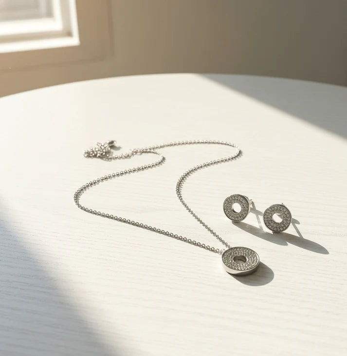 A beautifully crafted jewelry set featuring a sparkling round cubic zirconia pendant paired with elegant matching stud earrings. Designed for everyday wear as well as special occasions, this set combines modern minimalism with high-end shine. Available in Gold and Silver, it complements every outfit effortlessly.